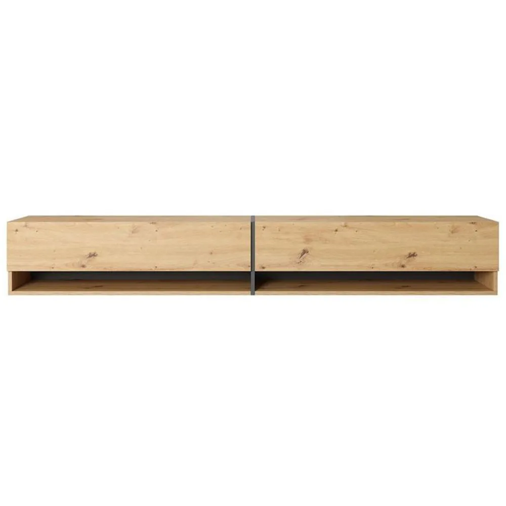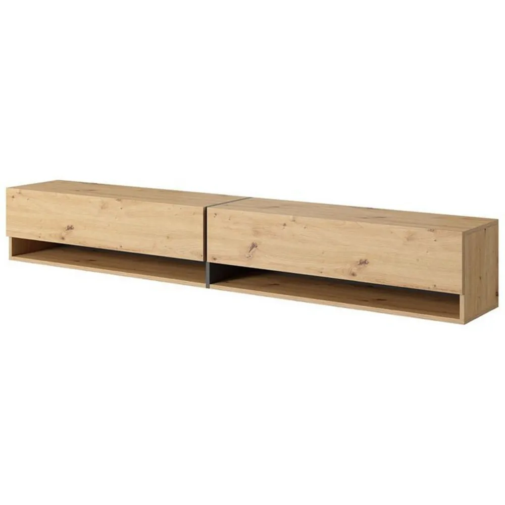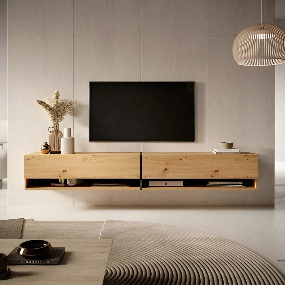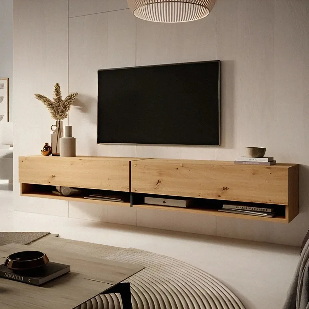 میز TV دیواری تمام امدیاف با روکش بلوط برجسته، انتخابی شیک و مدرن برای خانههای امروزی است. این محصول به دلیل طراحی دیواری، فضای زمین را اشغال نمیکند و جلوهای مینیمال و مرتب به سالن میبخشد.